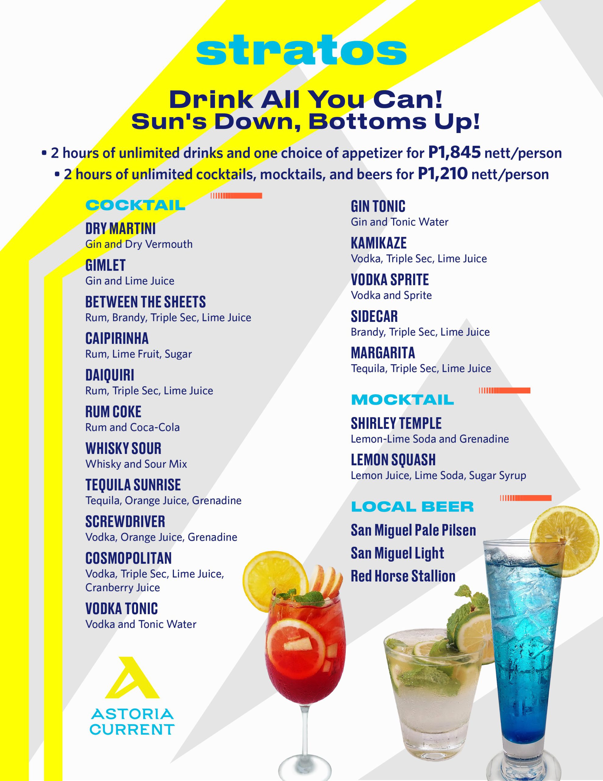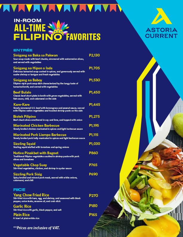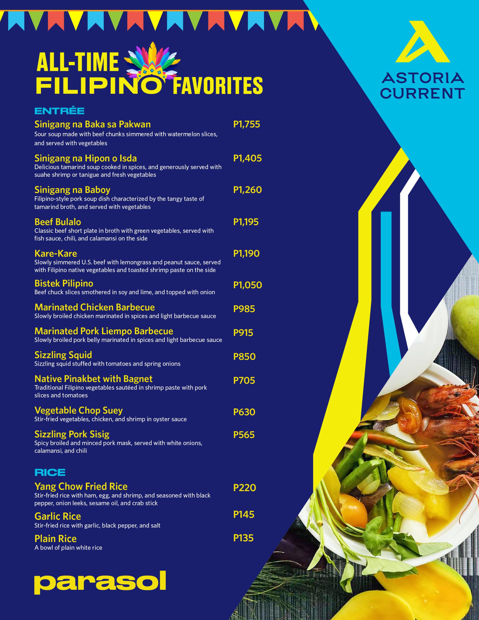 Astoria Current’s Parasol takes pride in its orchestra of continental flavors. Elevate your dining experience in Boracay’s most electrifying resort when you dine either indoors or al fresco!