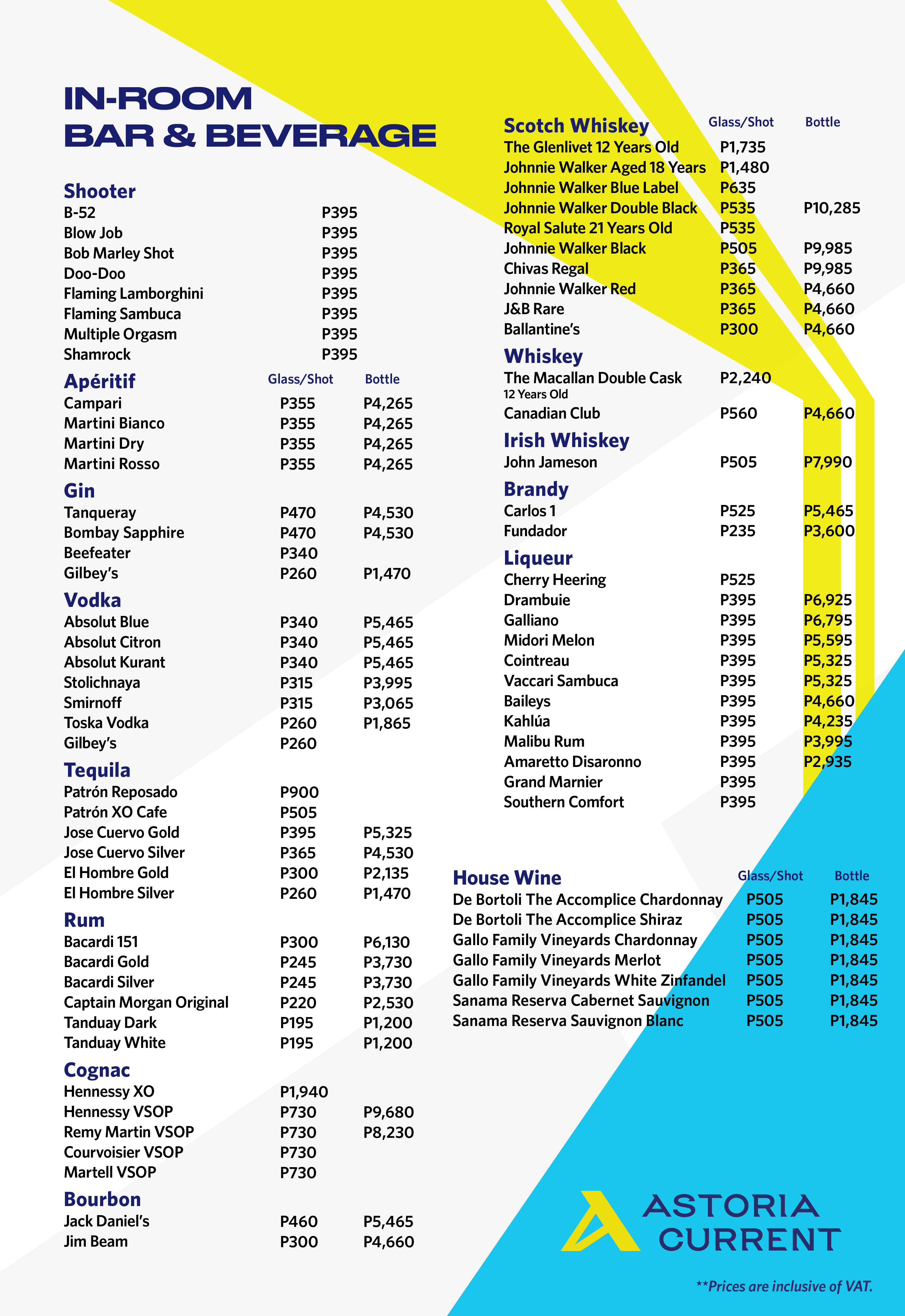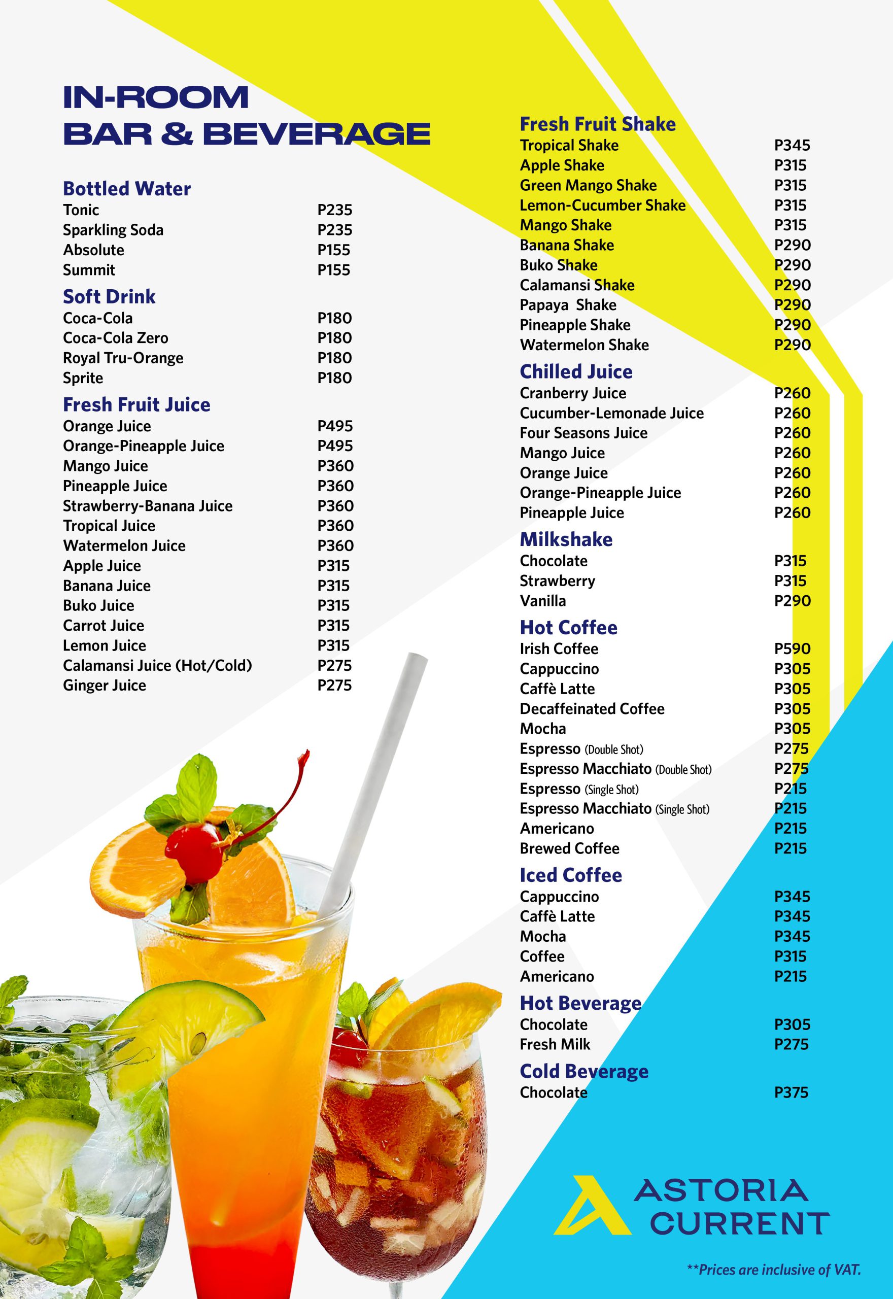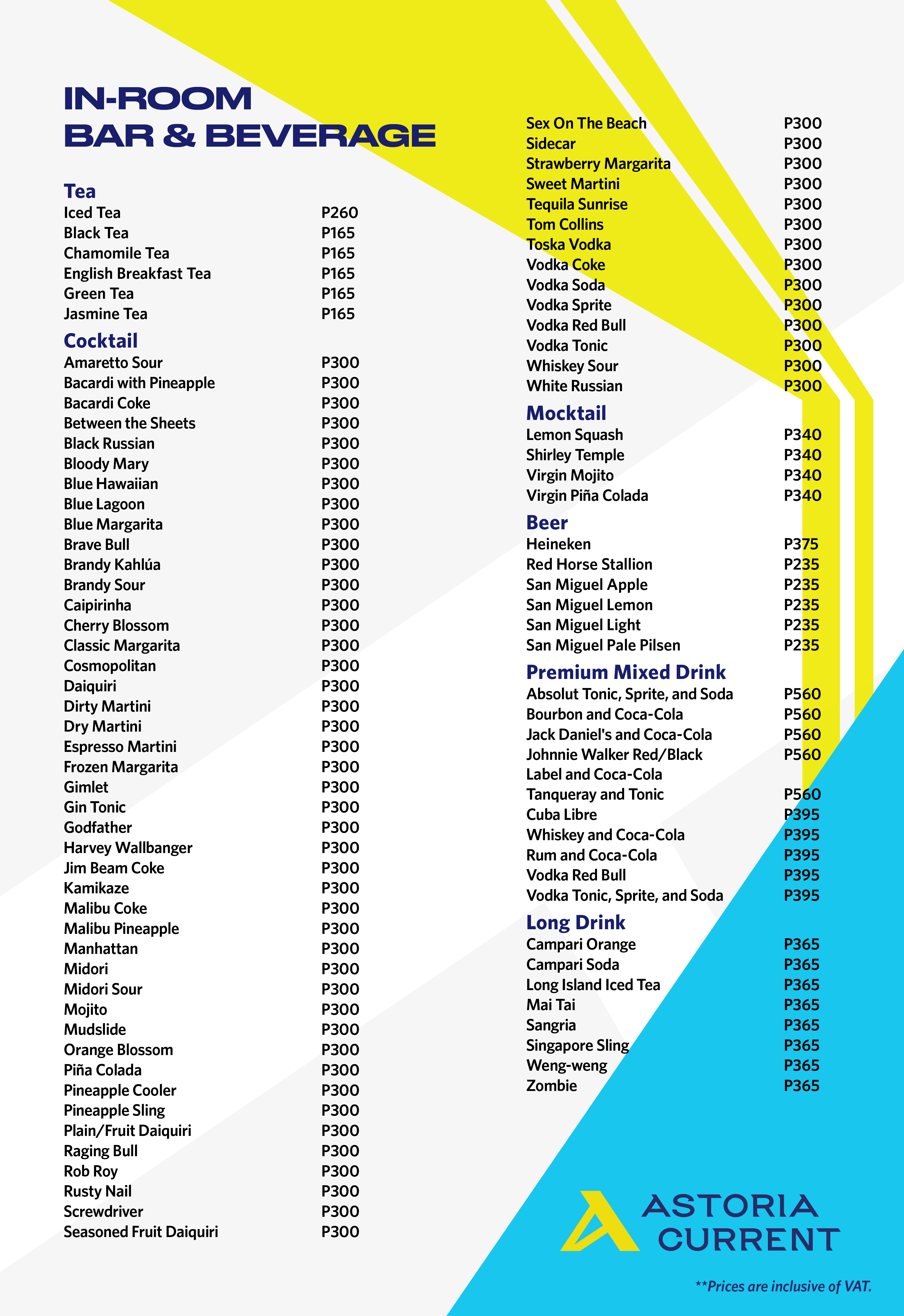 *In-room service will incur a 10% surcharge on top of the regular rates above.