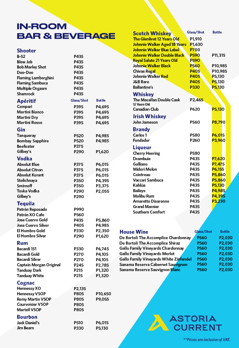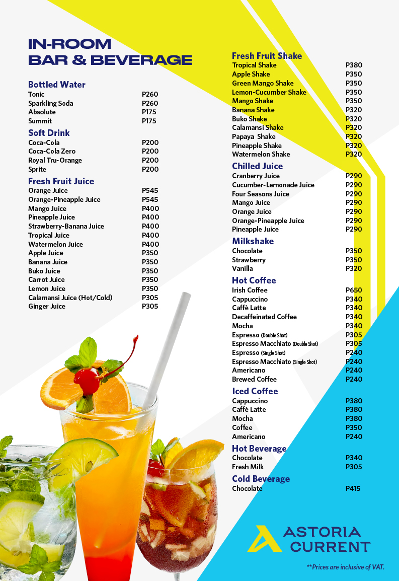 *In-room service will incur a 10% surcharge on top of the regular rates above. **Prices above are inclusive of tax.